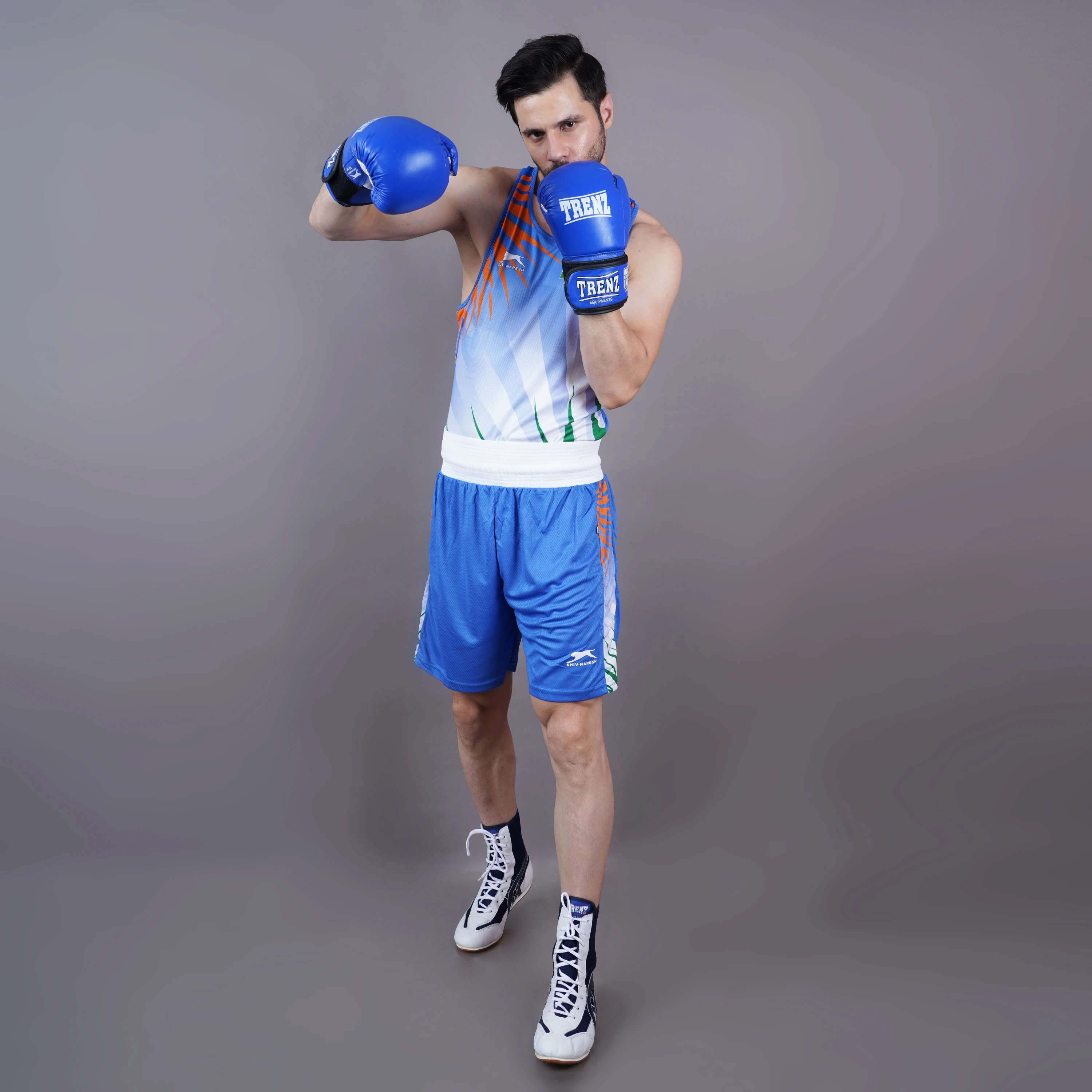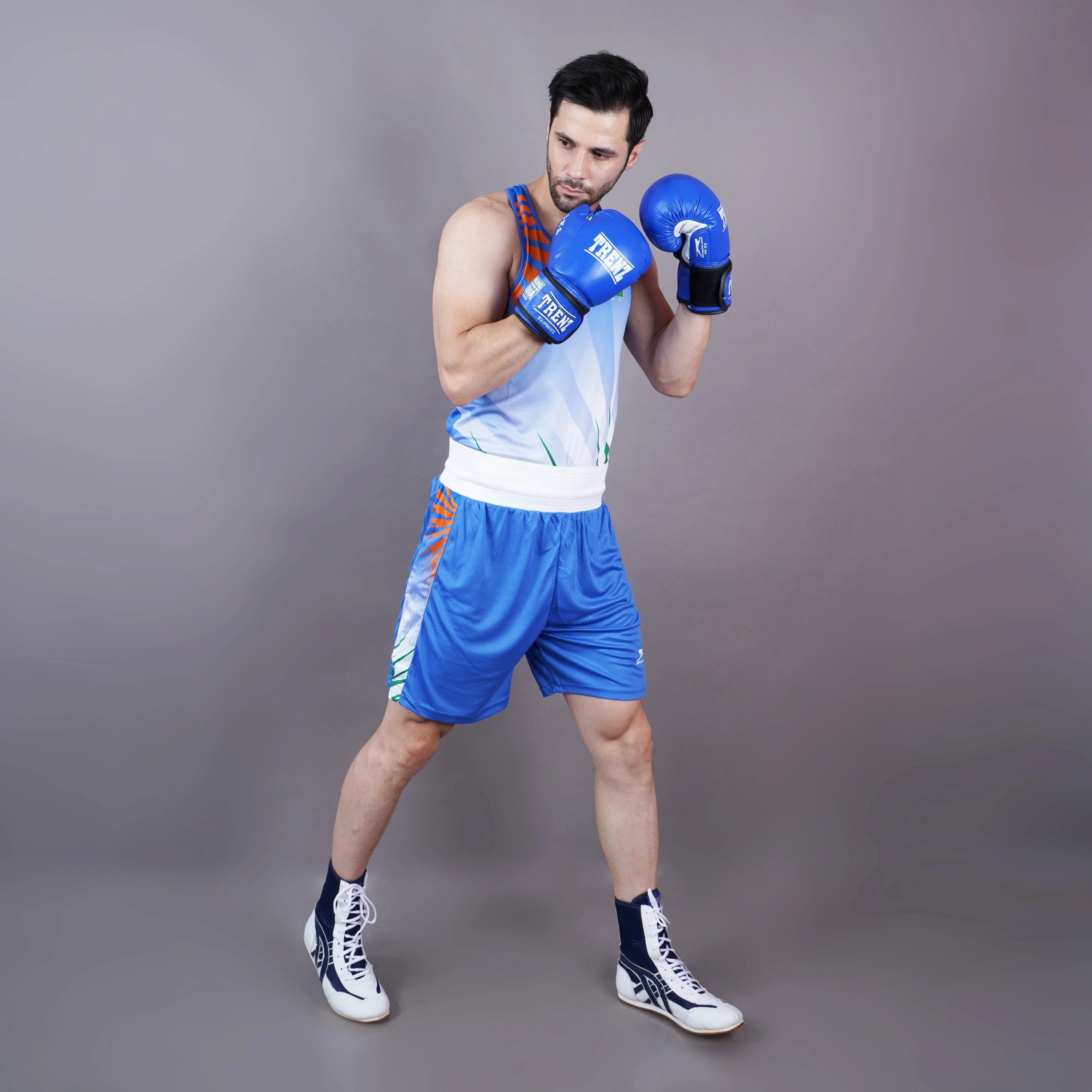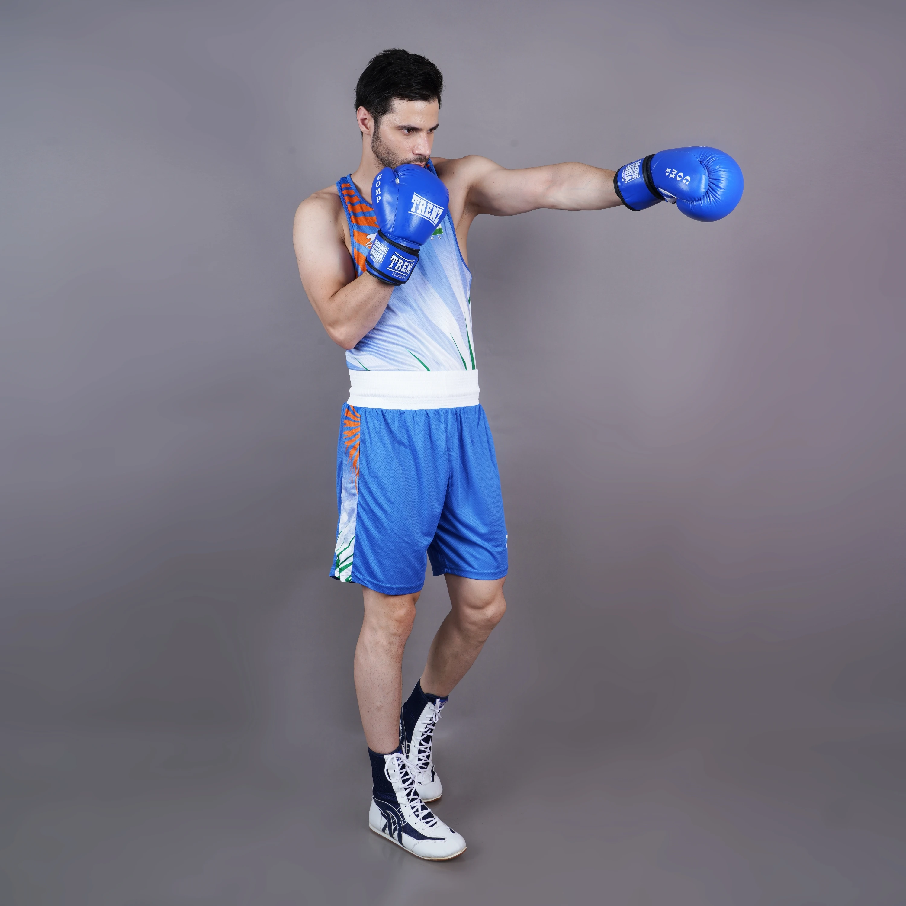 Unleash your fighting spirit in this high-performance men’s boxing set, designed for both training and competition. Featuring a sleeveless tank top and matching shorts in dynamic shades of red with bold streaks of white and green, this set proudly incorporates the colors of the Indian flag—complete with a mini flag emblem on the chest. The lightweight, breathable fabric ensures maximum comfort and mobility, while the elastic waistband provides a secure fit. Finished with matching red and white high-top boxing shoes for optimal ankle support and grip in the ring. Perfect for amateur and professional boxers alike.