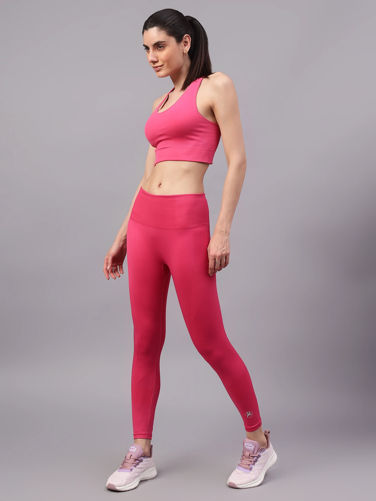 The matching high-rise leggings are made from premium nylon for a feather-soft feel and are tailored with a seamless, body-sculpting fit that hugs your contours and offers complete freedom of movement. The knitted waistband ensures a snug yet comfortable fit, while the moisture-wicking fabric keeps you dry and fresh all day.